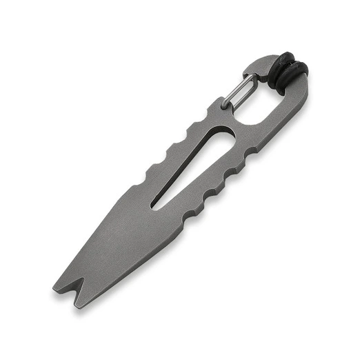 This tool was made in collaboration with Jesper Voxnaes. Can be use as lever and nail clipper, also as bottle opener, karabiner and shackle opener. The highlight is the hard metal glass breaker at the rear end between the O-rings. These rings cover the spike in everyday life and prevent injuries. They automatically shift to the side when the glass breaker is being used. The Tool is entirely made of titanium, so it only weighs 19 grams.