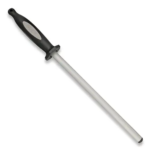 387 mm overall. 254 mm sharpening steel. 100% diamond coated oval surfaces. 750 medium grit on both sides. Black composition handle with Buck logo insert. Lanyard hole.