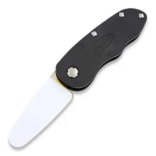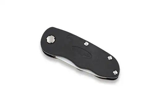 2 5/8″ tapered double sided Ceramic 1 micron grit and Diamond 25 micron grit stone. Smooth, flat surface allows for easy sharpening. Uses no oil or water. Stone folds into 3 3/8″ black Zytel handle for convenient storage when not in use. Depress button lock to flip the stone out of the handle. In the open or closed position the sharpener resembles a pocket knife. Hang packaged.