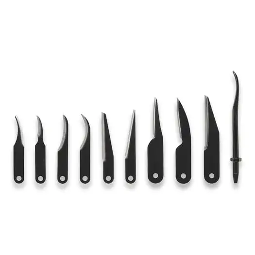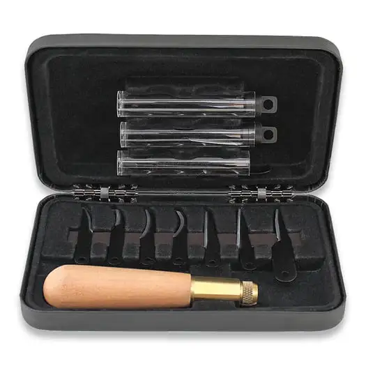Carbon steel blade. Wood handle. Pack of 6 small detail blades: 8 mm x .762 mm; 20E x 24 mm radius ground on the outside curve; 21EX straight blade; 11 straight blade ground on the slanted edge; 10 25 mm radius ground on the inside curve; 8 51 mm radius ground on the inside curve; 22 51 mm radius ground on the inside curve; 1-LD64 mm x .1270 mm heavy duty blade; 1-LN89 mm x .1270 mm carving blade; 1-LS38 mm x .1270 mm carving blade, 1-LBG- #7 sweep gouge 8 mm cut. Handle with three way brass jaw chucking system. Magnetic carrying case. Boxed.