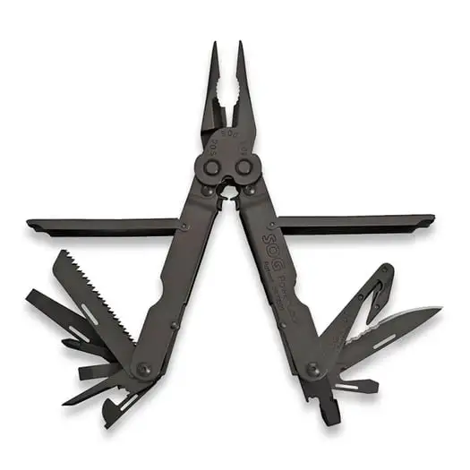 All stainless construction with black finish. Pivoting handle covers increase comfort. Features include needlenose pliers, wire cutters, wire crimper, blasting cap crimper, large screwdriver, partially serrated blade, v-cutter, can opener with small screwdriver tip, bottle opener with screwdriver tip, 1/4″ drive, Phillips screwdriver, wood saw, awl, and metal file. All tools lock and are accessible when tool is open.